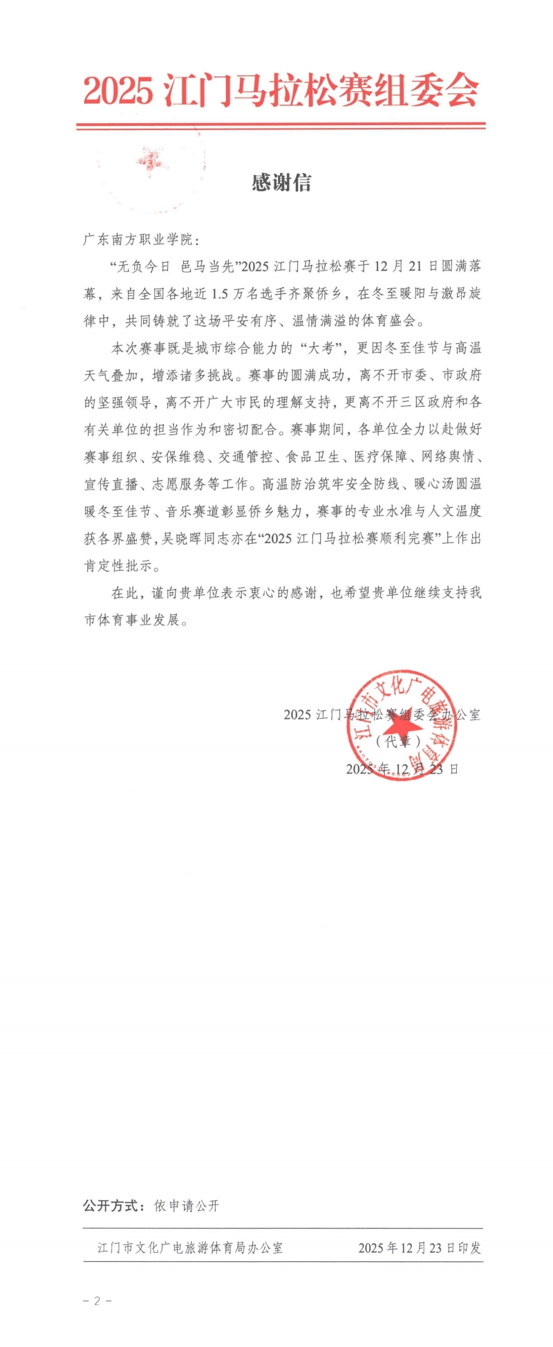 近日,广东南方职业学院收到2025江门马拉松赛组委会的感谢信,对该校740名青年志愿者在赛事中的出色表现表示衷心感谢。