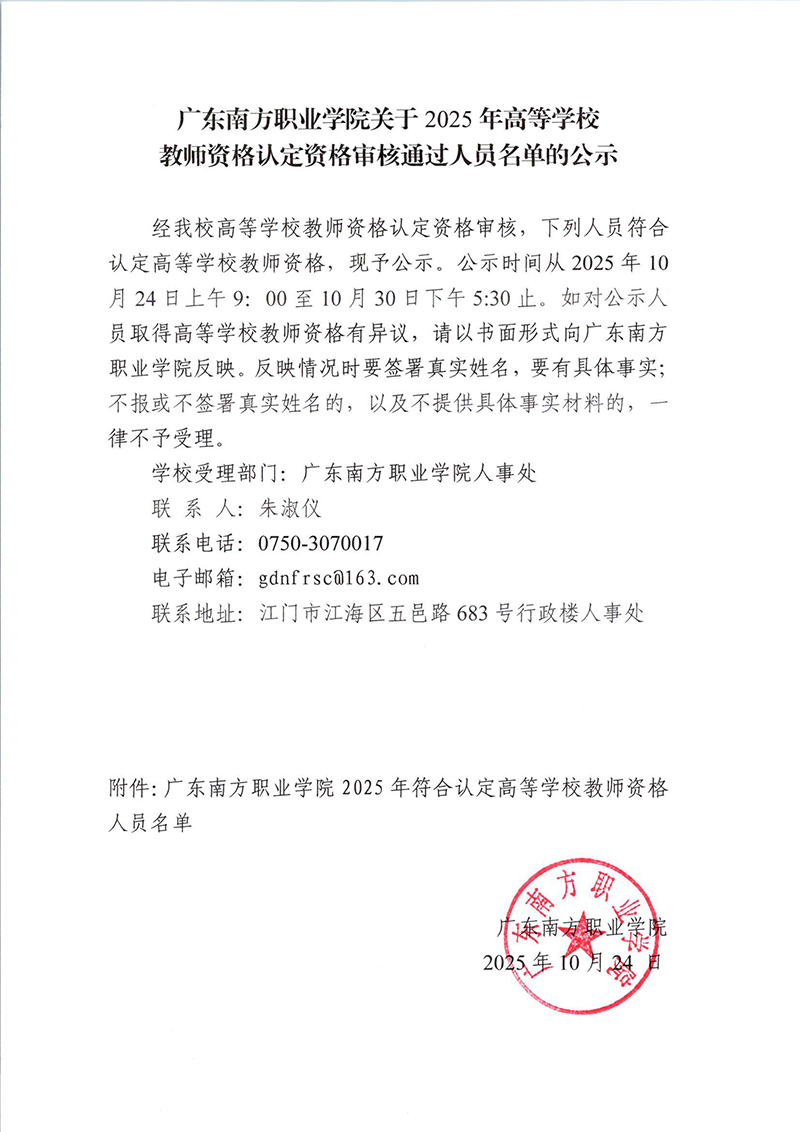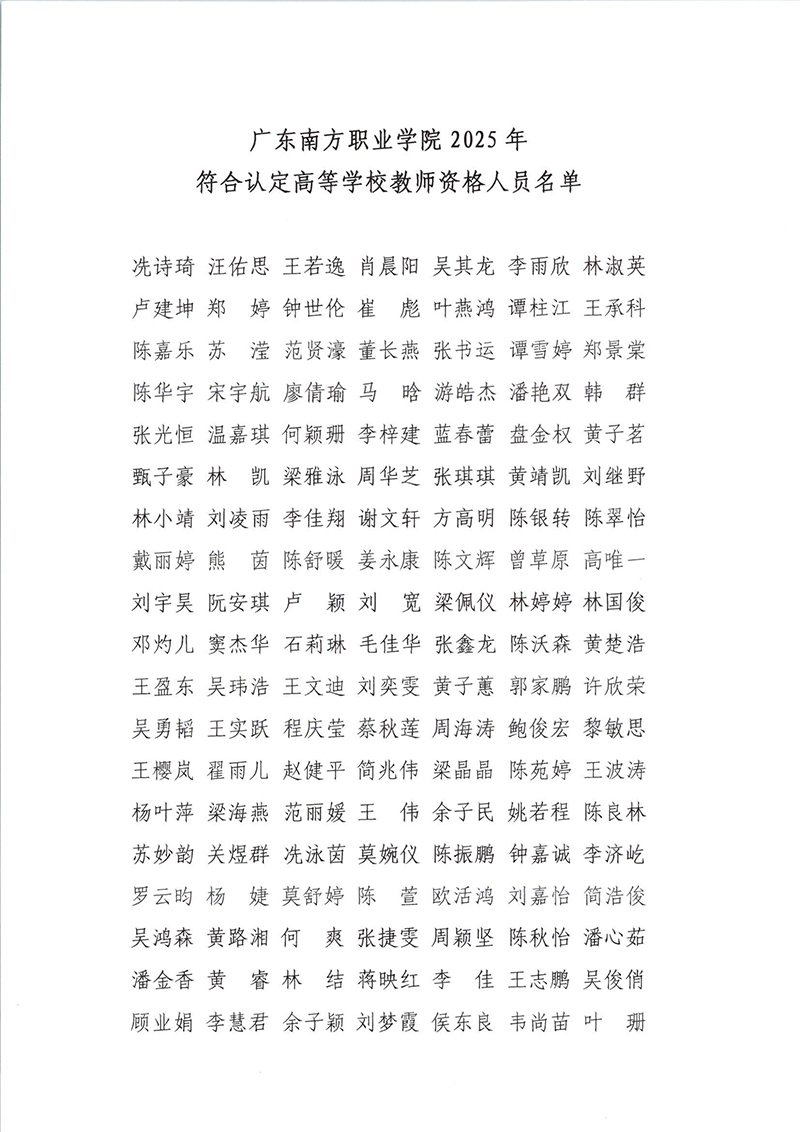 附件:广东南方职业学院关于2025年高等学校教师资格认定资格审核通过人员名单的公示