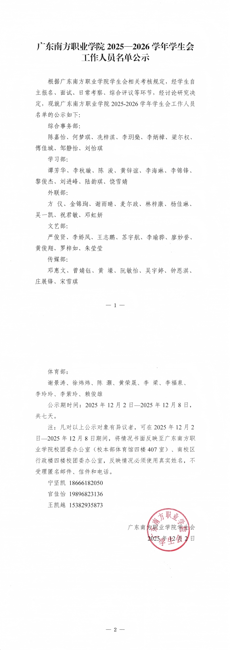 广东南方职业学院2025—2026学年学生会工作人员名单公示