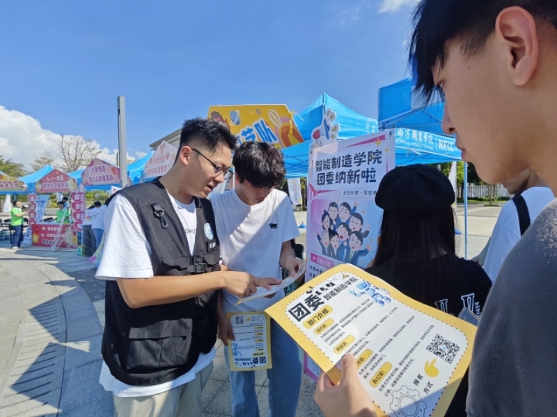 为充实智能制造学院团委、学生会队伍,为智能制造学院团委、学生会注入新鲜血液,智能制造学院于2025年10月15日积极参与了在广东南方职业学院南校区明德广场举办的全校社团机构招新活动。各学院社团机构摊位沿广场有序排布,特色展示与热情讲解交织成热闹图景。其中,智能制造学院团委与学生会的招新点凭借清晰的部门职能介绍和细致服务,吸引大批新生驻足咨询,为学院学生工作储备新鲜力量。