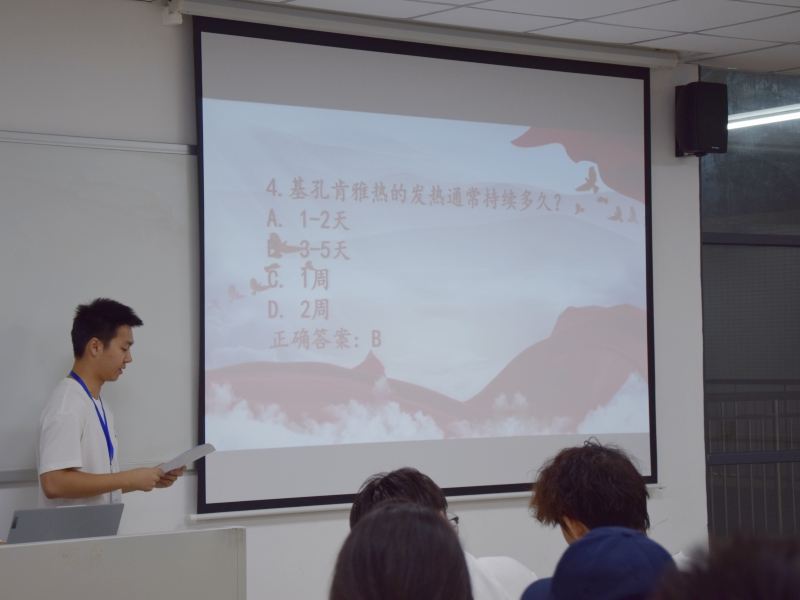 活动伊始,主持人向各参赛队伍详细宣读了竞赛规则、流程及题型。本次竞赛题目涵盖选择、判断、填空三大类型,内容紧密围绕江门市“两清一灭”工作要求与校园生活实际,全面考察了登革热与基孔肯雅热的病原特征、传播途径、典型症状,以及防蚊灭蚊、环境清理、个人防护等核心知识。