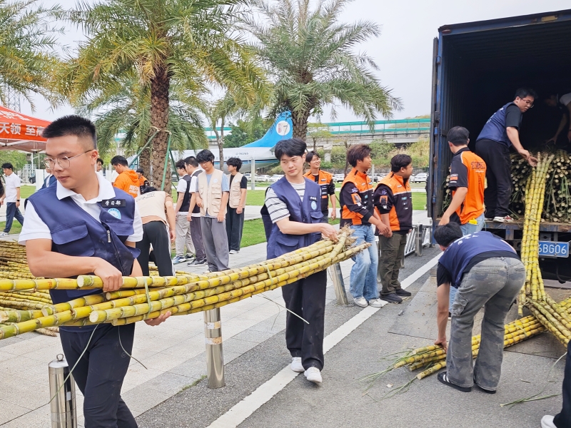 活动筹备阶段,现场分工明确、井然有序,工作人员提前抵达校本部励耘广场,有条不紊地做好各项准备。他们分工协作,将一根根粗壮挺拔、裹着翠绿蔗叶的甘蔗依次卸车、仔细检查,再整齐码放在发放区域,清甜的果香在空气中弥漫开来,吸引着过往师生纷纷驻足。