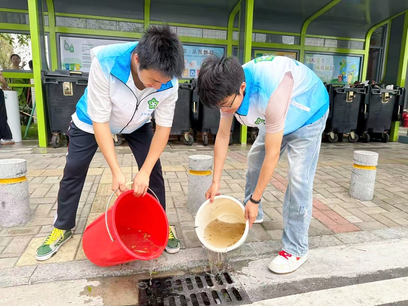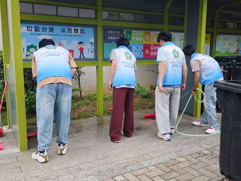 活动伊始,志愿者们便在明德书院前整齐列队,精神饱满、整装待发。在明确任务分工和防疫要求后,大家迅速投入到校园环境整治工作中。志愿者们手持扫帚、簸箕、水桶等清洁工具,对明德书院周边道路、绿化带、垃圾分类亭等重点区域展开了全面细致的清扫。现场分工有序、配合默契。大家不仅认真清理路面落叶、树枝及各类杂物,还对地面污渍和卫生死角进行了反复冲刷与彻底清除。针对蚊虫滋生的关键环节,志愿者们重点排查并彻底清除各类积水容器、水桶、水管,对垃圾分类亭、排水沟等重点区域进行冲刷清洗,彻底清除淤泥、污渍与积水隐患。志愿者们干劲十足,不放过任何一个细节,确保整治一处、清洁一处、靓丽一处,以实际行动为打造干净整洁、健康安全的校园环境贡献力量。
