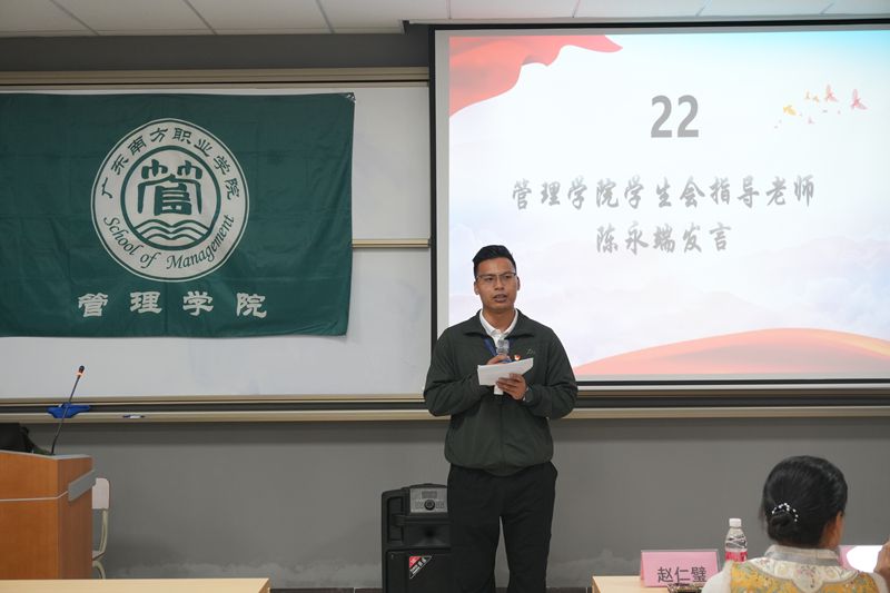 紧接着,学生会指导老师陈永端上台作总结讲话。首先,他祝贺大会成功举办,向卸任干部的辛勤付出表示感谢,高度肯定他们在服务同学、丰富校园生活、搭建师生沟通桥梁等方面的重要贡献,称赞他们以实际行动诠释初心,为学弟学妹树立了优秀榜样。其次,针对新一届骨干,他提出两点希望:一是坚守服务初心,认真倾听同学心声,及时回应同学关切;二是秉持务实作风,脚踏实地、精益求精地对待每一项工作。同时,他鼓励卸任同学将学生会经历化为宝贵财富,保持热情与担当,在未来的道路上不断提升自我。