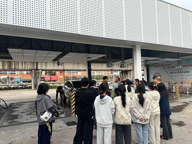 随后,张志勇代表学院向中心赠送慰问品,表达师生对员工的关怀与支持。实践中,在专业老师的指导下,师生们与“喜憨儿”员工结对参与洗车劳动。从喷泡沫、冲水到擦内饰,大家协作完成每道工序。劳动过程中,大家不仅学习了洗车技能,更在近距离交流中感受到他们的真诚与努力,现场洋溢着欢声笑语和互助温情。