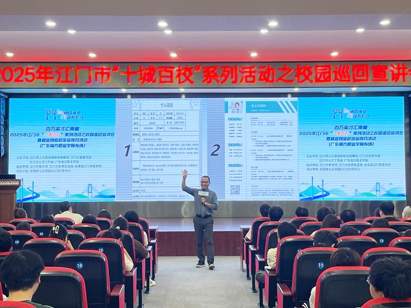 为响应系列就业文件号召,推进高校毕业生就业服务、提升青年对江门的认同感,江门市人社局联合市有关单位,依托“百万英才汇南粤”行动计划,精心打造“百万英才汇南粤”——2025年江门市“十城百校”系列活动。10月15日,本期校园巡回活动走进我校,于校本部图书馆五楼报告厅顺利举办。