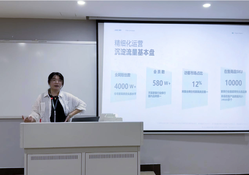 宣讲会上,林氏家居负责人通过讲述创始人林佐义“从万元起步到年销超2亿”的创业历程及“骑着三轮车周转于家具厂与物流之间”的早期故事,传递了品牌“敢知未来、正直务实”的精神内核。现场展示的数据更是极具说服力:2007年创立即登顶电商Top1,多次蝉联天猫家具类十一卫冕之王,2023年线下门店突破1500家,全网粉丝4000万+,会员数580万+,直观呈现了其“多平台、新零售、多品牌”的发展格局,让现场学子深刻感受到了品牌的惊人成长速度与行业影响力。