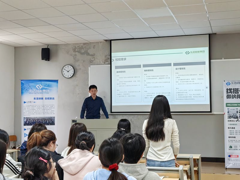 为助力应届毕业生精准对接优质就业资源,2025年10月22日下午,东浩财税集团专场校招宣讲会在我校校本部14111教室顺利举办。这场以“找搭子·做伙伴”为主题的宣讲会,聚焦会计专业学子就业需求,通过“介绍企业情况—解答疑问—现场面试”的闭环流程,为财经学子量身打造职场启航新机遇。