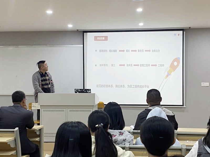 招聘会上,企业招聘团队通过PPT演示、现场宣讲等形式,全方位解读公司发展历程、园区环境、业务布局及薪酬福利体系。从免费住宿、餐补、五险一金等基础保障,到清晰的管理、技术双职级晋升通道、完善的技能培训资源,健全的福利政策与广阔的发展平台让在场学生备受鼓舞。为打通校企沟通“最后一公里”,企业现场组织建立微信招聘咨询群,安排专人实时解答简历投递、岗位适配、招聘进度等疑问,搭建起精准对接的“即时沟通桥梁”。学院辅导员团队与就业办老师全程到场协助,提供简历指导、求职答疑等贴心服务,助力学生以最佳状态展现专业素养。