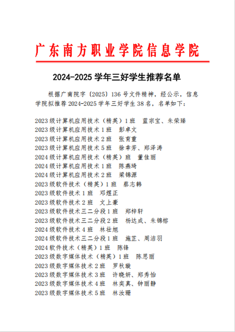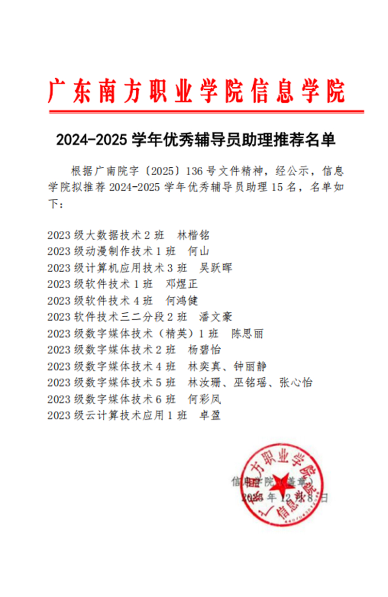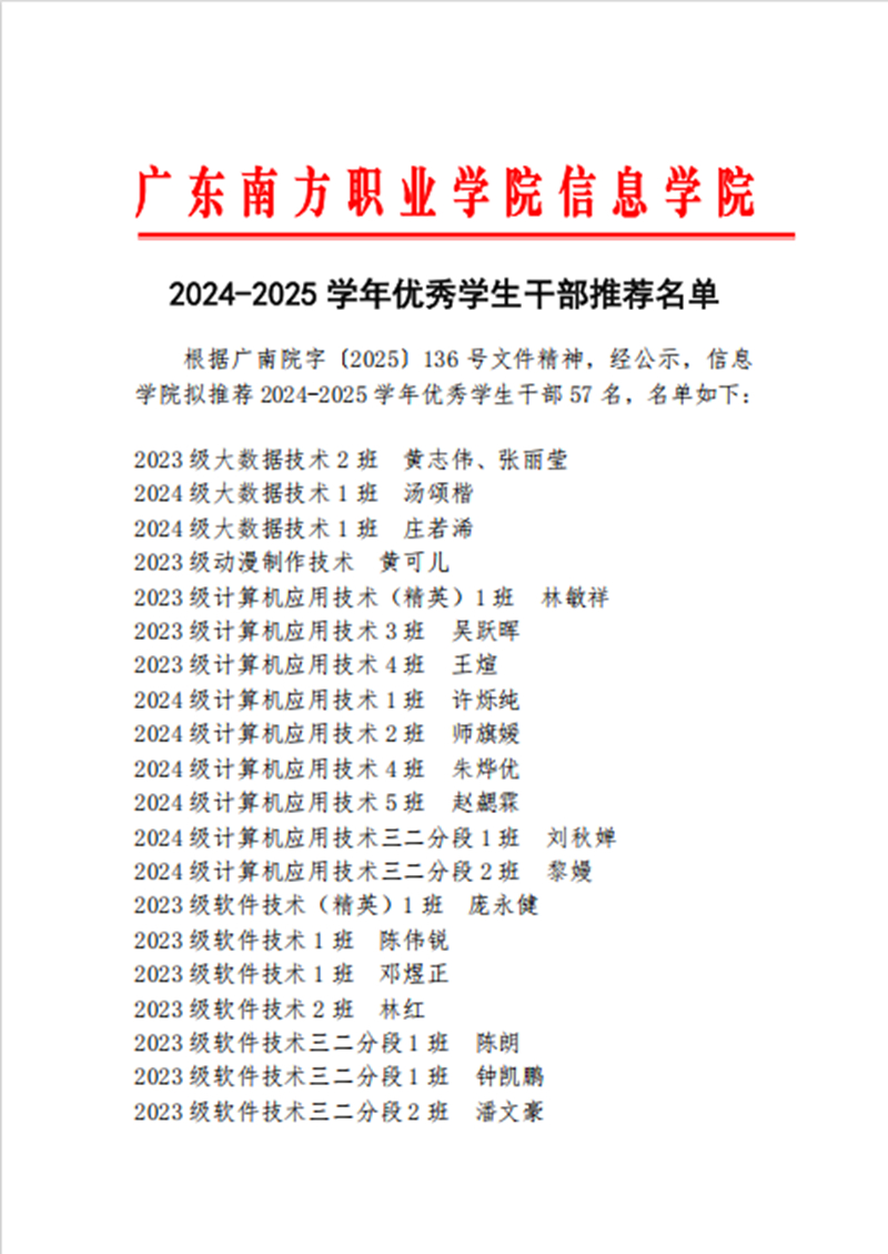 信息学院2024-2025学年三好学生、优秀学生干部、优秀辅导员助理推荐名单公示