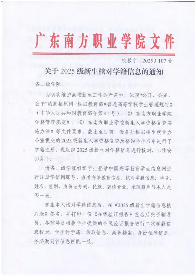 校教字〔2025〕107号 关于2025级新生核对学籍信息的通知