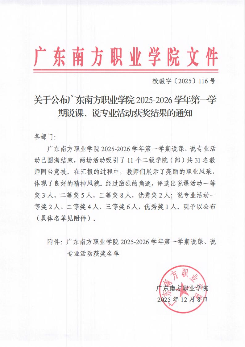 关于公布广东南方职业学院2025-2026学年第一学期说课、说专业活动获奖结果的通知