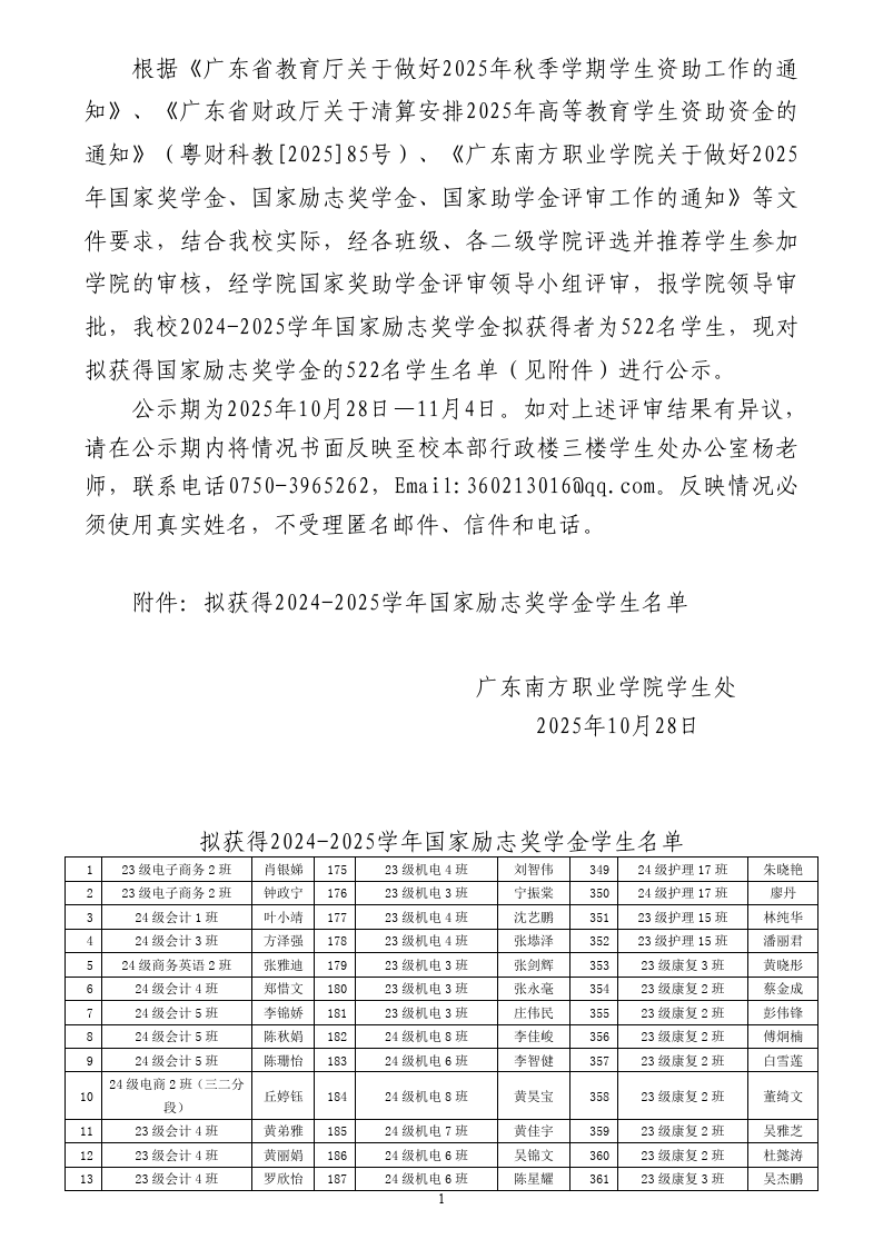广东南方职业学院2024-2025学年国家励志奖学金评定结果公示