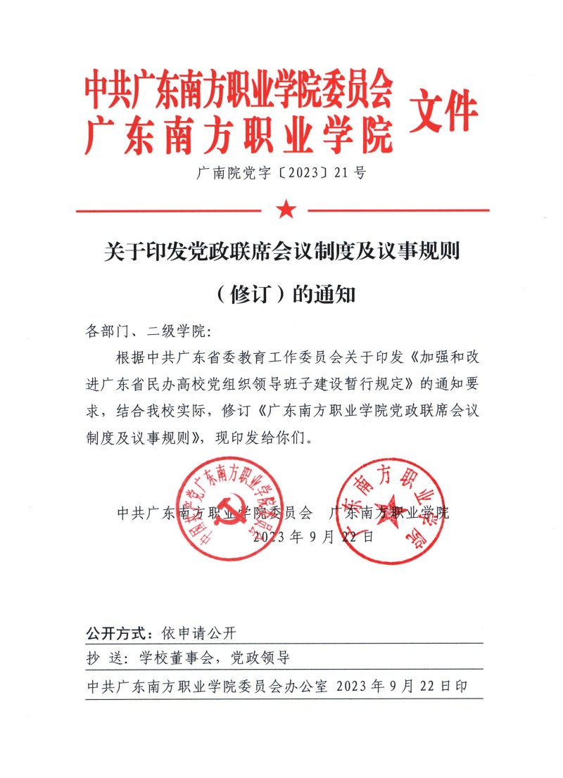 关于印发广东南方职业学院党政联席会议制度(修订)的通知
