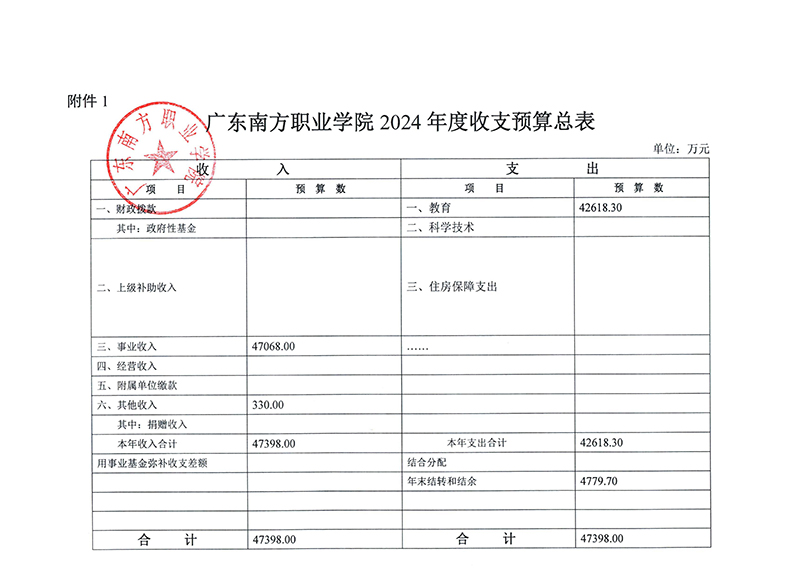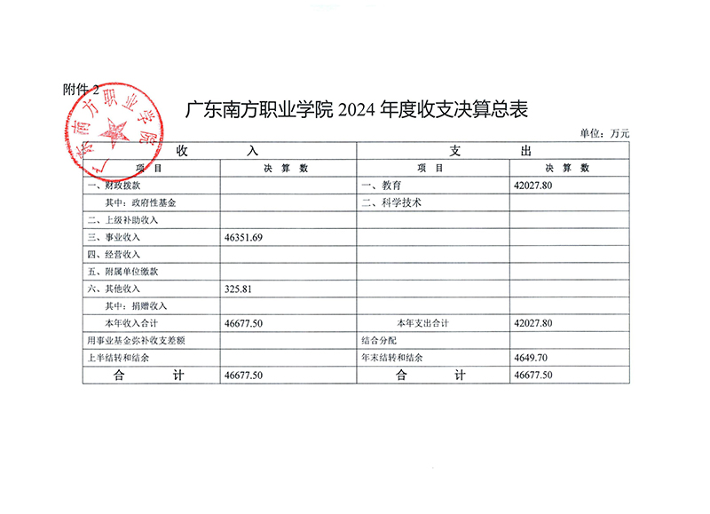 附件:广东南方职业学院2024年收支预算和决算表