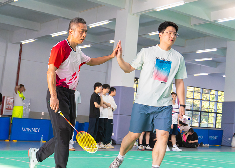 本届羽毛球混合团体赛是学校首次举办,吸引了8支队伍、共56名教职工运动员参与。比赛分别于校本部和南校区体育馆同步上演精彩对决。男双、女双、混双三大项目轮番登场,分组循环与交叉淘汰相结合的赛制兼顾竞技性与参与度,选手们挥拍如飞,羽毛球在球网间划出灵动弧线,尽显教职工们的灵动与风采。