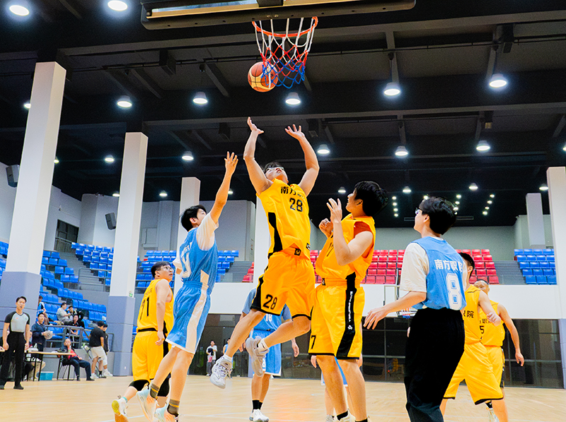 另一边的篮球场上早已人声鼎沸,来自行政职能部门联队、体育部及各二级学院的8支队伍、83名运动员英姿勃发,在校本部室内篮球场展开激烈角逐。小组循环赛与交叉淘汰赛的双重赛制,搭配最新篮球竞赛规则,让力量的碰撞、速度的角逐与团队的协作完美交融,每一次抢断、传球、投篮都引来场边阵阵欢呼。