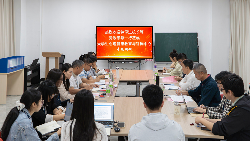 为深入贯彻落实教育部“健康第一”育人理念,扎实推进高校心理健康教育攻坚行动,筑牢校园心理安全防线,4月1日上午,校长钟仰进带队莅临大学生心理健康与咨询中心(下称“心康中心”)开展专题调研,分管校领导副校长卢东亮、党政办公室常务副主任孙冬生陪同调研,学生处处长张仕福、心康中心主任廖万敏、常务副主任李红梅以及全体心理健康教师参加调研座谈。