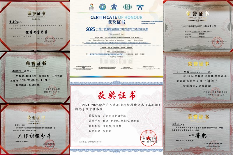 作为一名学生党员,李睿祎始终严格要求自己,在德、智、体、美、劳方面全面发展。他先后获得了“优秀学生干部”“优秀共青团员”等称号,被学院学生会评为“工作积极分子”“优秀干部”、更在2024-2025学年当选国家奖学金获得者,不仅如此,他在“‘一带一路’暨金砖国家技能发展与技术创新大赛第三届工业互联网网络互联技术赛项”“2024-2025年度广东省职业技能大赛网络系统管理赛项”“江门市知识产权与保护征文比赛”等各项比赛中屡屡获奖,累计获得国家级荣誉2项、省级荣誉1项、市级荣誉2项、校级及以下荣誉10项,同时还考取了红十字初级急救证。
