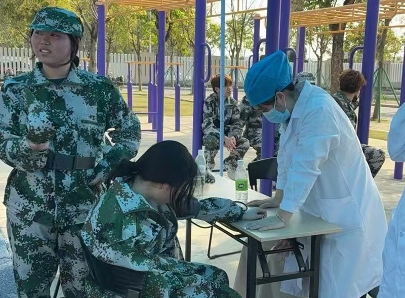 医务室医护团队提前部署、全程在岗,在军训场地设立临时医疗服务点,备齐防暑降温、外伤处理、应急救治等各类药品与器械,做到随时待命、快速响应。从测量血压、冰敷消肿,到伤口消毒、应急护理,医护人员耐心细致地为出现不适的同学提供诊疗服务,用专业操作缓解身体病痛,用温柔话语安抚紧张情绪,让每一位参训学生都能感受到贴心的关怀。