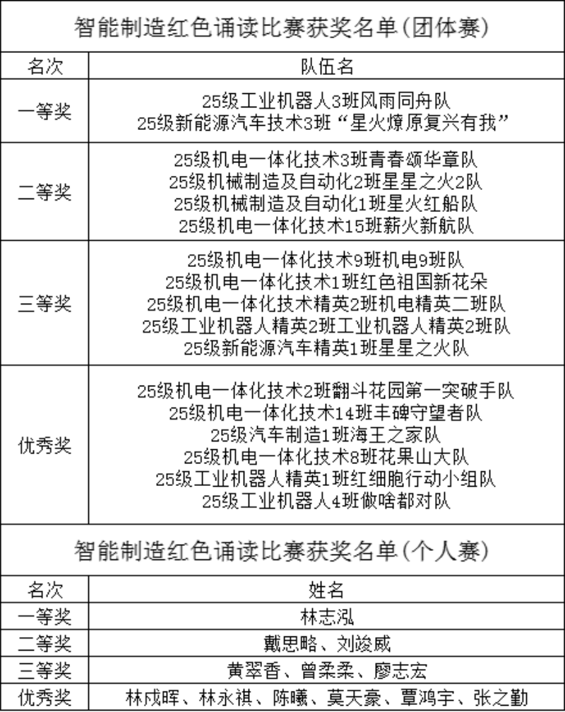 智能制造学院“薪火声传”红色经典诵读比赛获奖名单(详见附图)