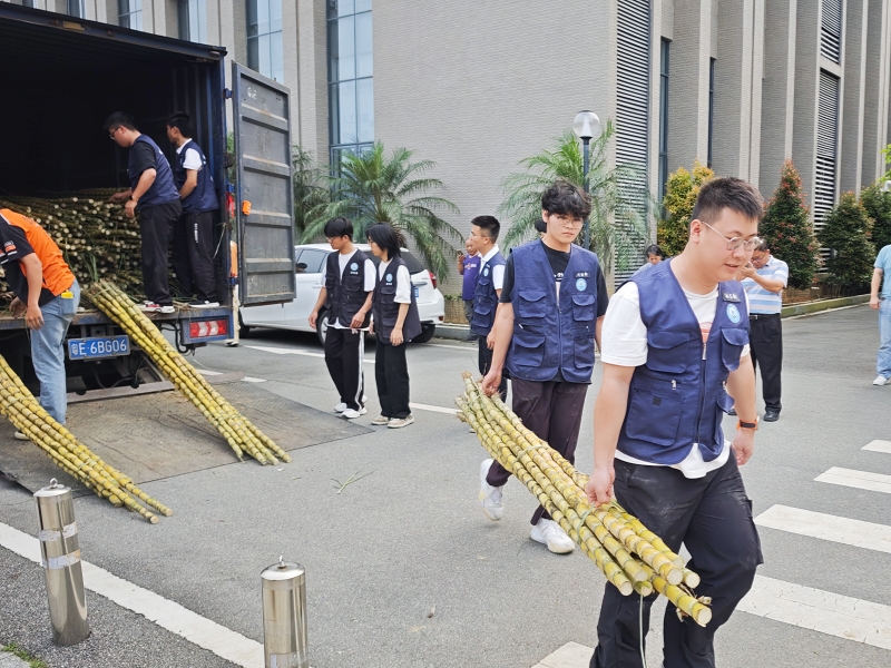 活动筹备阶段,现场分工明确、井然有序,工作人员提前抵达校本部励耘广场,有条不紊地做好各项准备。他们分工协作,将一根根粗壮挺拔、裹着翠绿蔗叶的甘蔗依次卸车、仔细检查,再整齐码放在发放区域,清甜的果香在空气中弥漫开来,吸引着过往师生纷纷驻足。