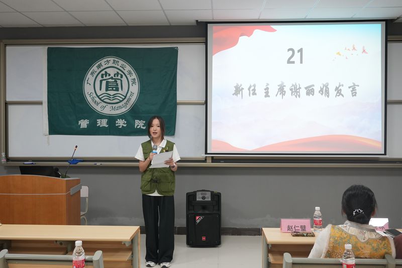 授牌仪式结束后,新任学生会主席谢丽娟上台发言。她代表新一届主席团感谢领导老师的关心支持和上一届干部的辛勤付出,回顾了上一学年学生会围绕学校中心工作,在思想引领、校园文化、社会实践等方面开展的清明祭扫、演讲选拔赛、护河清淤、“三下乡”等多项重点工作。展望未来,她承诺将秉持全心全意为同学服务的宗旨,在继承优良传统的基础上勇于创新,提升服务精准度,打造更具影响力和活力的品牌活动,以高效执行力和创新担当精神服务广大同学。同时,她希望同学们能积极建言献策,共同将学生会打造成成长路上的同行者与暖心港。