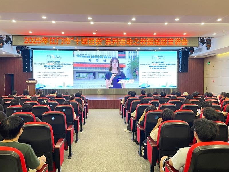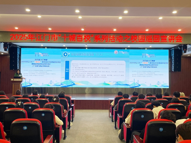 为响应系列就业文件号召,推进高校毕业生就业服务、提升青年对江门的认同感,江门市人社局联合市有关单位,依托“百万英才汇南粤”行动计划,精心打造“百万英才汇南粤”——2025年江门市“十城百校”系列活动。10月15日,本期校园巡回活动走进我校,于校本部图书馆五楼报告厅顺利举办。