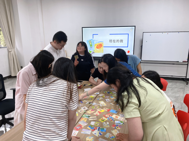冯老师让辅导员们分别选取代表“理想的我”“现在的我”两个主题的卡牌,根据看到的图像进行自由联想,表达内心的感受。通过分享连接自我、了解自我、探索自我,并找到“破局的方法”“身边的资源”。研讨环节中,辅导员们分享日常工作中遇到的学生心理议题,探讨如何更好地识别和处理学生的心理问题。