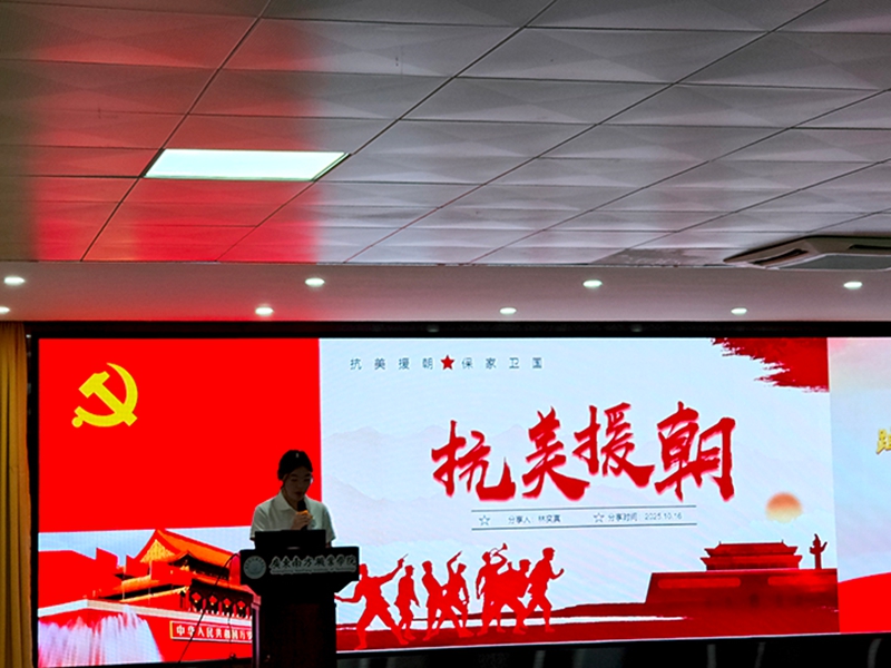 在分享环节中,何彩凤与林奕真两位同学分别围绕“铭记历史 薪火相传”和“抗美援朝”主题进行了宣讲。