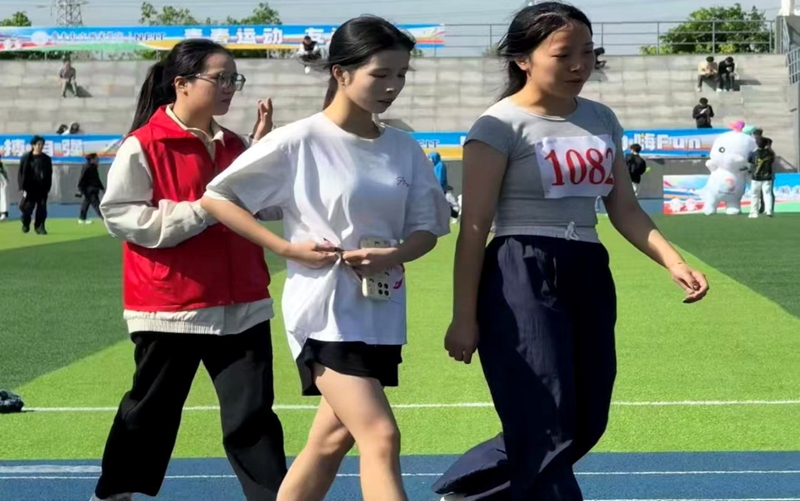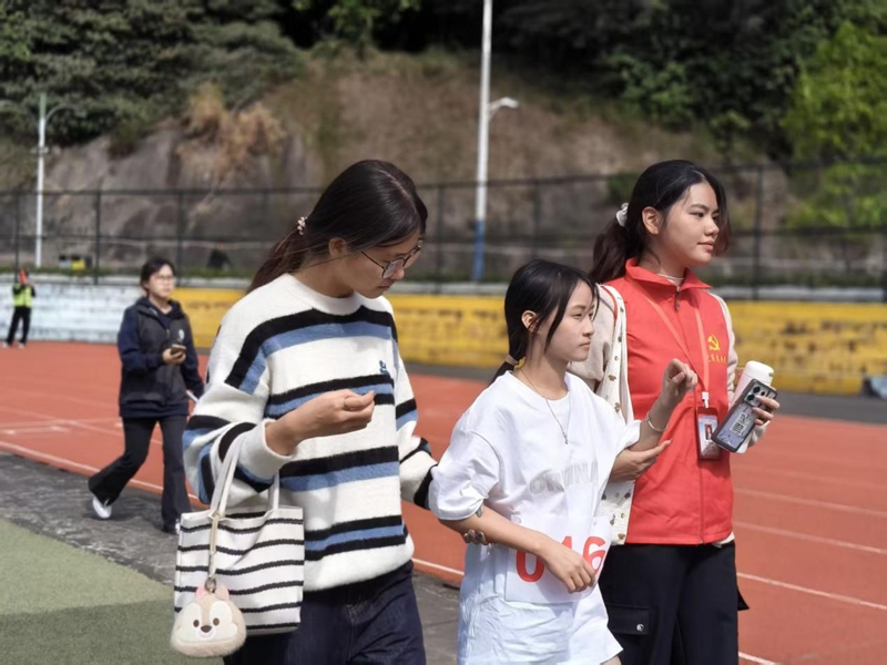比赛期间,志愿者们身着红马甲,以“一对一”模式全程紧跟结对运动员。在短跑赛道旁,他们提前协助运动员做好热身准备,整理运动装备;待比赛结束后,第一时间穿越人群上前搀扶,递上饮用水与毛巾,缓解运动员体力消耗。跳远赛场边,志愿者精准把控比赛节奏,及时提醒运动员参赛时间,协助核对参赛信息;中长跑项目中,他们全程在场边陪伴,实时关注运动员状态,在赛程中途提供补给支持,为选手们加油鼓劲。