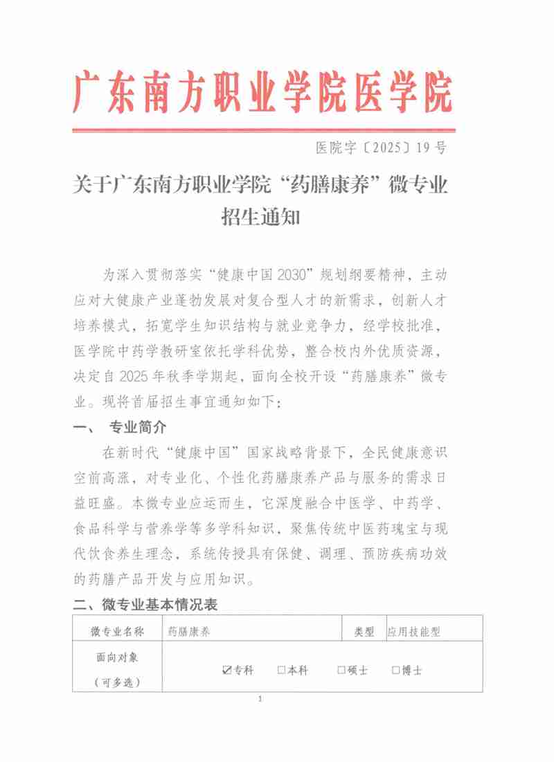 附件:关于广东南方职业学院"药膳康养"微专业招生通知