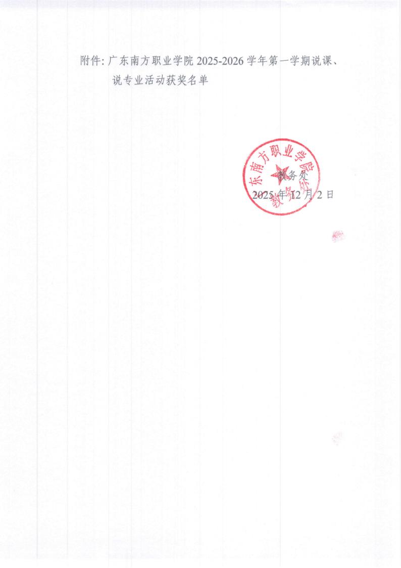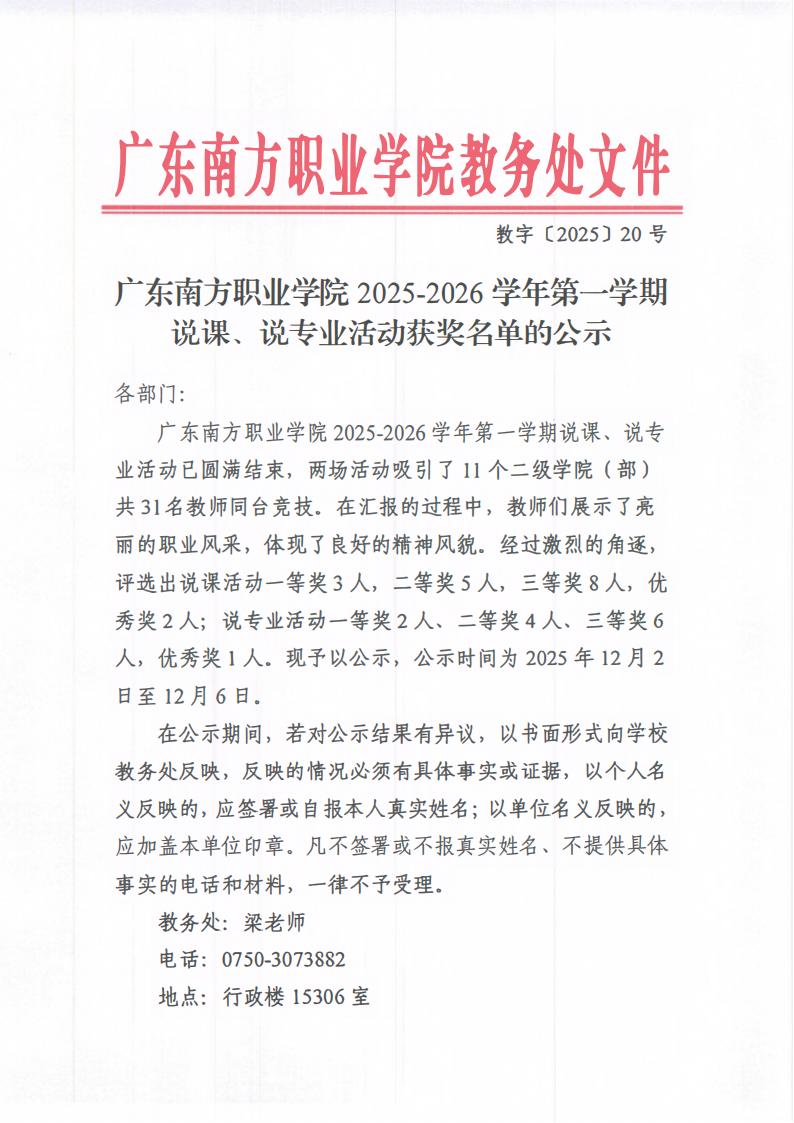 广东南方职业学院2025-2026学年第一学期说课、说专业活动获奖名单