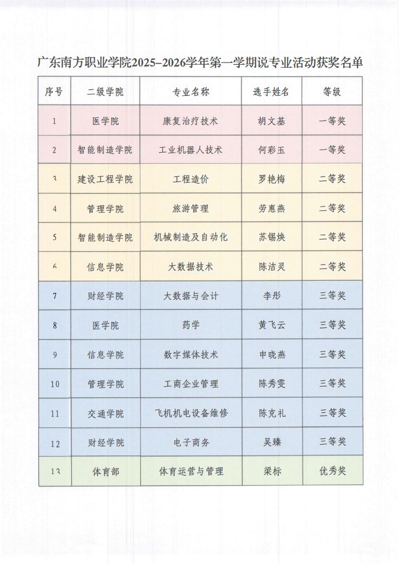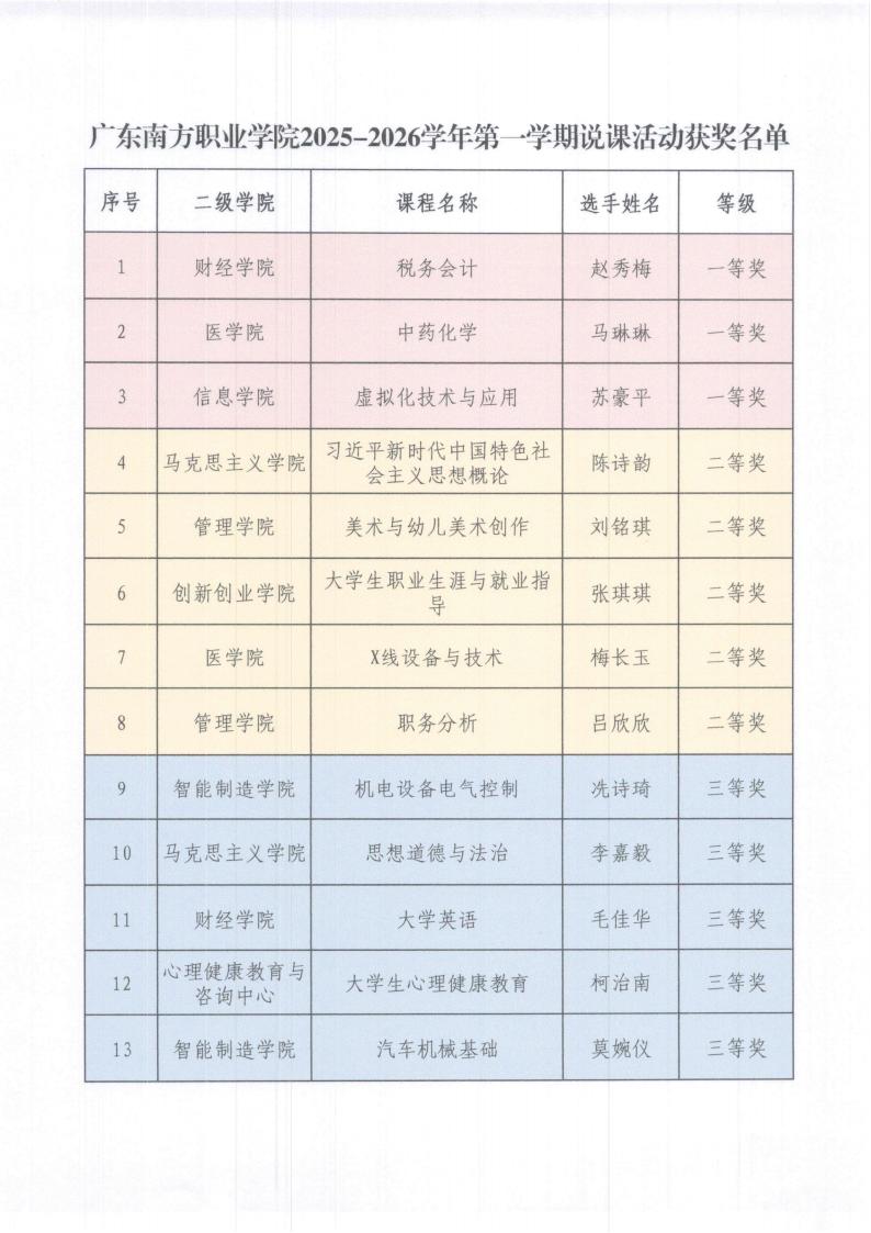 关于公布广东南方职业学院2025-2026学年第一学期说课、说专业活动获奖结果的通知