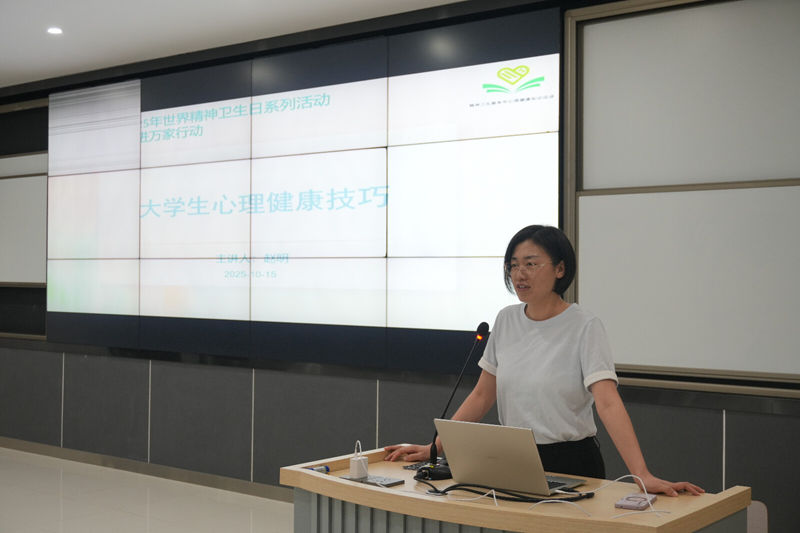 赵明医生以《大学生心理健康技巧》为题,分析了大学生群体的心理发展特点,详细介绍了大学生常见心理问题,如考试焦虑、人际关系困扰、适应困难等,并分享可以采取哪些策略来应对心理问题。赵医生还重点讲解了如何识别心理障碍,以及如何进行科学的干预与转介。此外,赵医生还特别剖析了心理疾病的“病耻感”问题,强调寻求心理帮助与治疗身体疾病无异,是负责任、有智慧的表现,有效帮助学生树立了科学的心理健康观念。