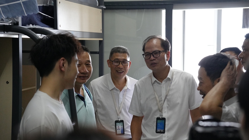 此外,学校领导对新生入住情况高度重视。当天早上,钟仰进校长、廖葵中书记、钟兆明校长、何周林主任、李浩东主任、黄永伦主任、林贞音院长等领导一行,深入各书院的新生宿舍进行走访慰问。
