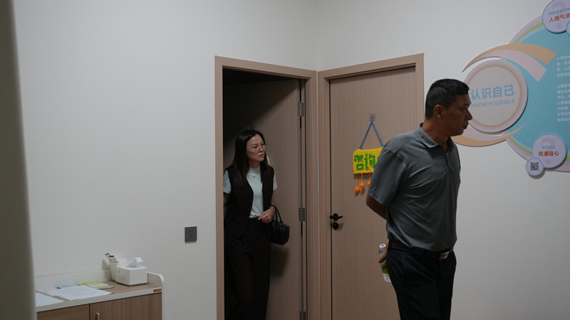 在书院管理中心主任黄永伦的陪同下,夏连虎校长一行首先实地参观了我校精心打造的“一站式”学生社区。他们深入社区内的党建活动室、心理辅导驿站及生活服务空间等功能区域,亲身感受了集教育、管理、服务于一体的社区化育人新生态。参观过程中,黄主任详细介绍了社区的空间布局、功能整合、运行机制以及如何将育人力量下沉到学生生活第一线的具体做法。