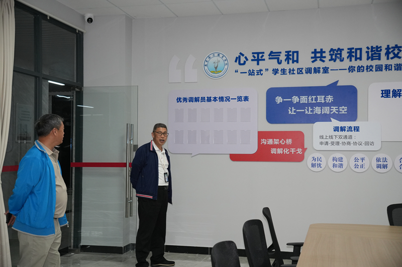 在心康中心,钟兆明、廖万敏关切地了解了日常咨询、教育活动开展情况及专业设备配置,强调要持续加强心理健康服务体系建设,为学生健康成长保驾护航。在新近启用的调解室,钟兆明指出,建立这一平台是构建和谐校园的重要举措,要发挥其化解学生矛盾、促进沟通理解的积极作用,培养学生理性平和、友善互助的品格。
