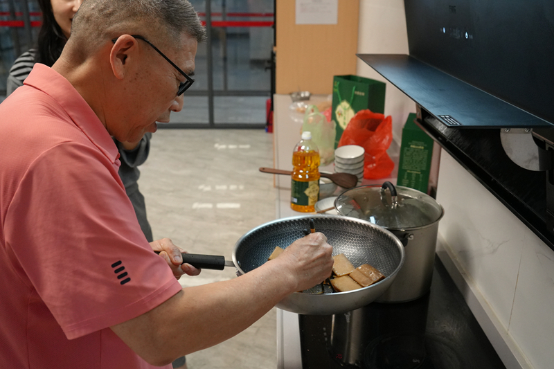 傍晚五时许,明德书院共享厨房内暖意融融。钟副校长与同学们亲切互动。不同于往常的座谈交流,这次他走进了共享厨房,带领大家一同烹制客家风味美食。煎年糕、炸煎堆、煮酸菜肉卷汤……一道道地道的客家佳肴在师生协作中陆续出炉。“客家美食讲究的是家常味,今天和大家一起做,就是希望大家在校园里也能感受到家的温暖。”他一边熟练地翻煎着年糕,一边向师生们介绍每道美食背后的文化寓意。