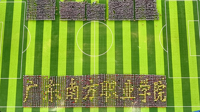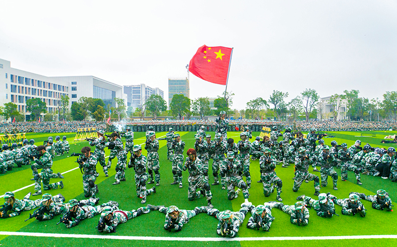 大会开始前,各营连队整齐列阵,在绿茵场上汇成一片迷彩海洋。“升国旗,唱国歌!”雄壮的国歌响彻田径场上空,万余名师生肃然起立,目光追随着五星红旗在晨光中冉冉升起。家国情怀在无声中扎根心田,表彰大会就此拉开序幕。