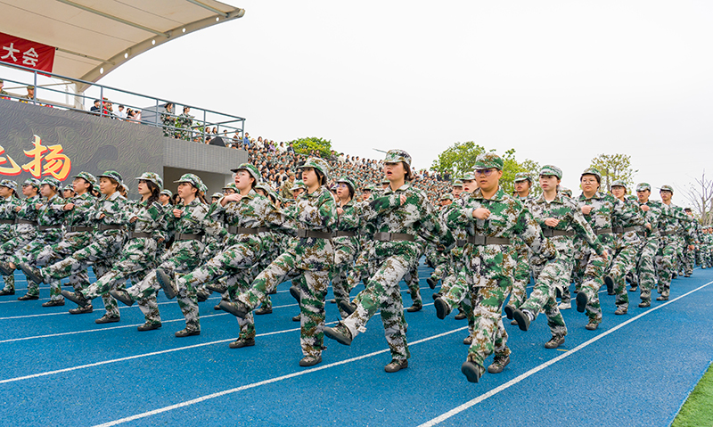 升旗仪式后,军训成果汇报正式开始。在总教官黄溁林的指挥下,参训学生以营、连为单位依次进行分列式展示。各方队步伐整齐、口号嘹亮,依次通过主席台。“忠诚于党,热爱人民,报效国家,献身使命”“乘风破浪,一往无前”等口号响彻田径场上空,展现了南职学子昂扬向上的精神风貌。