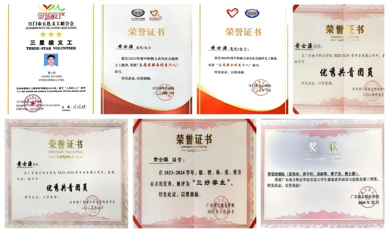 与此同时,黄士源以医学学子的身份深耕志愿服务。他江门义工总服务185次,服务时长779小时6分。从江门市中心医院门诊义工到广东省“百千万工程”三下乡活动,他把医学知识转化为服务动能,在社区服务、实践行动中绽放光彩,以实际行动践行党的宗旨,展现党员担当,努力在奉献中提升自我,为社会传递温暖与正能量。
