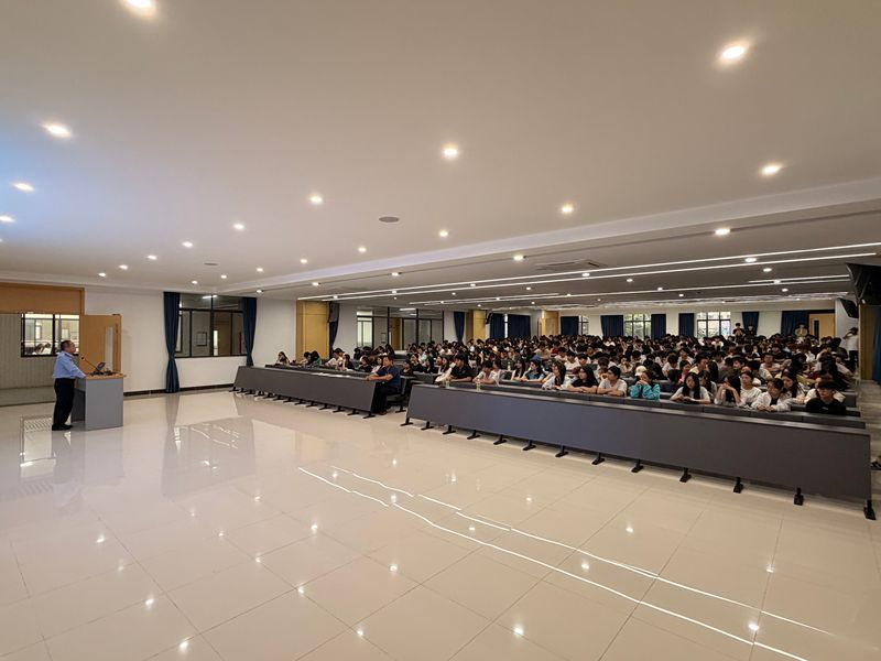 与此同时,校本部的讲座现场同样氛围浓厚。江海交警大队徐穗芬结合自身宣传经验,用通俗易懂的语言,聚焦“一盔一带”安全守护、校园周边交通隐患排查、应急处置方法等重点内容,向同学们普及交通安全法律法规。她结合高校周边车流、人流特点,详细讲解了如何安全通过路口、避让车辆,以及乘坐网约车、共享单车的安全常识,现场解答同学们关于交通出行的疑问,引导同学们树立“安全第一、文明出行”的理念,争做交通安全的践行者和宣传员。