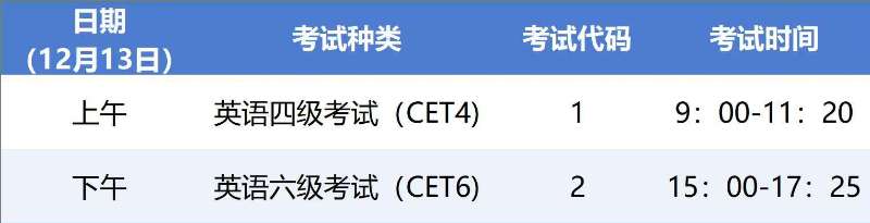 一. 考试日期为2025年12月13日,考生可于12月5日9:00起登录全国大学英语四、六级考试报名网站(http://cet-bm.neea.edu.cn)进入“快速打印准考证”,自行下载并打印笔试准考证(为避免考前集中下载打印引发网络拥堵,请同学们提前下载打印)。